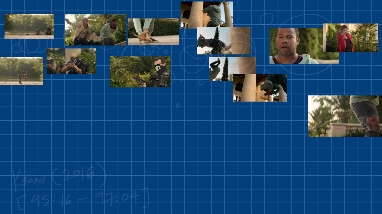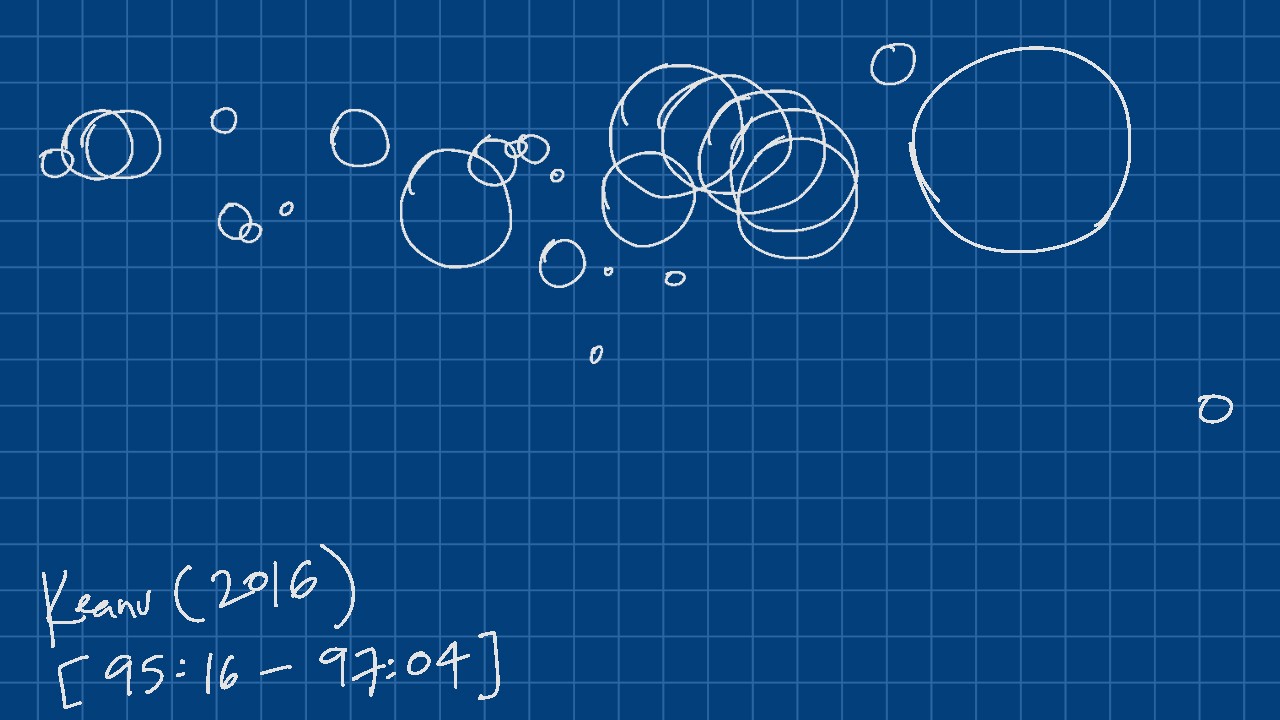 Since this is part of the finale, the expected tempo is supposed to be high energy anyway, so we can observe that there are no large dips in bubble size or position from one another, therefore maintaining that high energy and excitement, peaking at the moment were Peele does a backflip against a pillar, whilst holding Keanu and being shot at by the Don and his goons, successfully completing an unnecessary slow-motion stunt, only to be shot in the leg and butt immediately after.