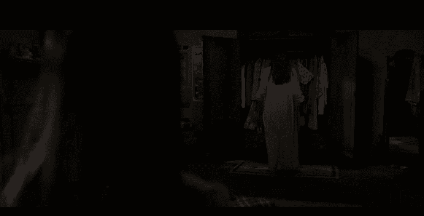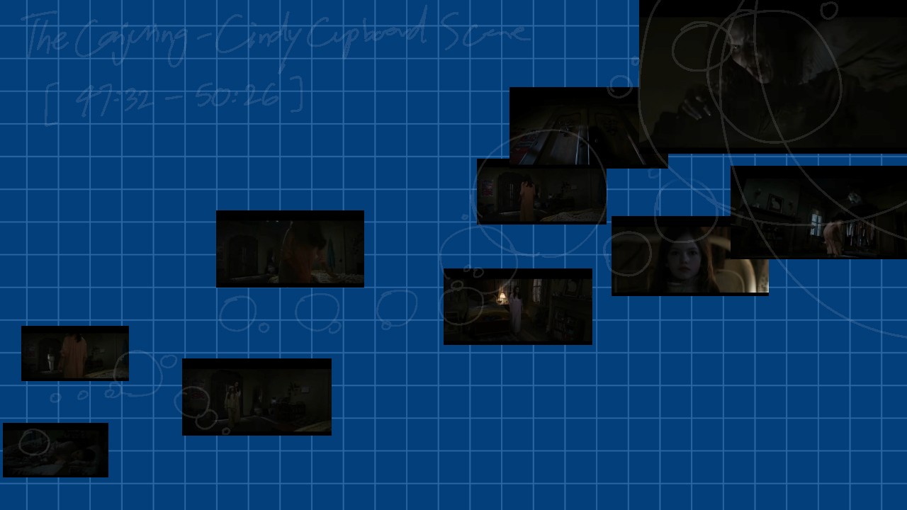 You can see that Cindy's head banging creates a rhythm, a predictable pace for the audience's tension, where the setup is being build up, eased off slightly when Andrea opens the cupboard but immediately jumps up in intensity when its revealed that the haunting entity was on top of the cupboard with them, instead of inside it.